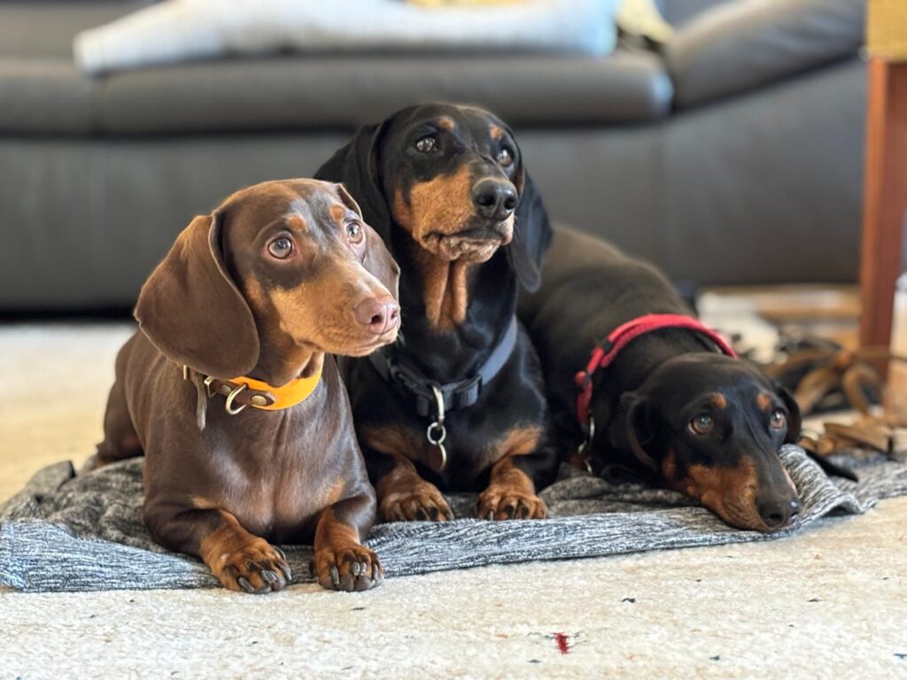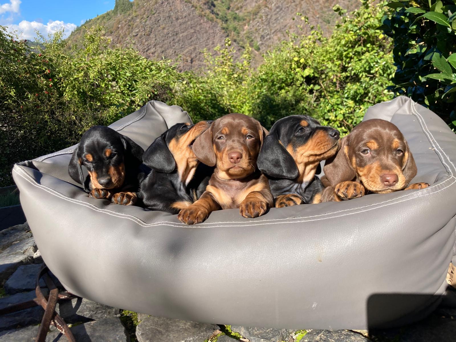 Jagdgebrauchsteckel, VDH, Kurzhaardackel in schwarz-rot und schoko,